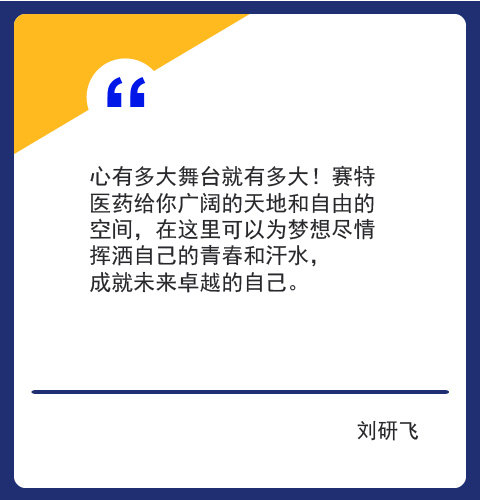 赛特医药倡导积极向上的企业文化,以文化聚人才,倡导坦诚沟通、团结协作、诚实敬业,尊重个性并包容不同文化,努力营造良好的工作氛围。